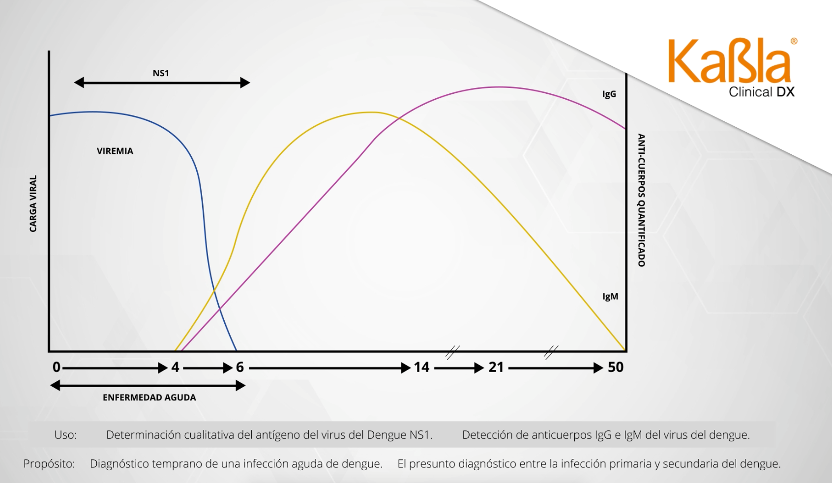 La detección simultánea del antígeno NS1 y los anticuerpos IgG e IgM proporciona una visión integral del estado de la infección por dengue. El antígeno NS1 es detectable en las etapas tempranas de la infección, generalmente entre el día 1 y el día 5 después del inicio de la fiebre, lo que permite una identificación precoz de la enfermedad. La detección de anticuerpos IgM suele comenzar alrededor del día 5 de la enfermedad y persiste durante varias semanas, indicando una infección reciente. La presencia de anticuerpos IgG, que pueden detectarse junto con o después de los IgM, sugiere una infección pasada o una infección secundaria.